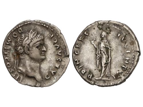 IMPERIO ROMANO. Denario. 75 d.C. DOMICIANO. Anv.: CAES. AVG. F. DOMIT. COS. III. Cabeza laureada a derecha. Rev.: PRINCEPS IVVENTVT. Esperanza a izquierda con flor alzándose el vestido. 3,35 grs. (Leves oxidaciones). Pátina. BMC-156; C-375; RIC V-788. MBC+.