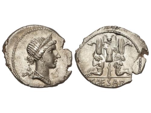 IMPERIO ROMANO. Denario. 46-45 a.C. JULIO CÉSAR. GALIA. Anv.: Cabeza diademada de Venus a derecha, detrás Cupido. Rev.: Trofeo de armas Galas en medio de Galia sentada a izquierda y Vercingetorix cautivo a derecha. En exergo: CAESAR. 3,77 grs. (Grieta, leves oxidaciones). ESCASA. C-13; Cal-645; FFC-11; Crawford-468/1; Sydenham-1014. MBC+.