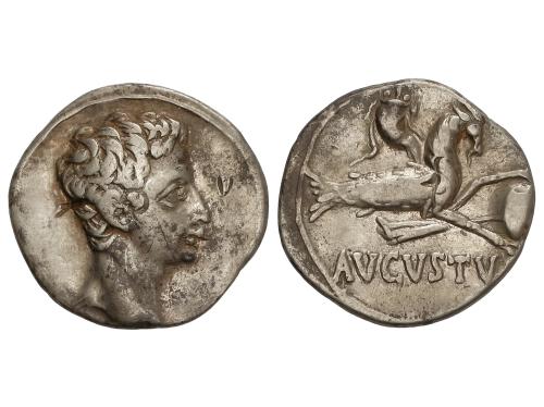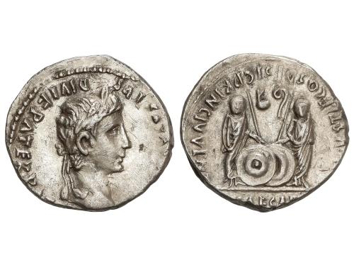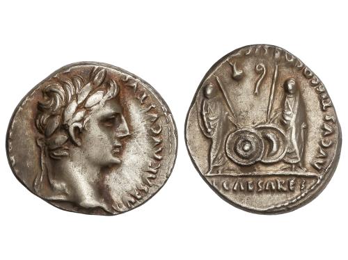 IMPERIO ROMANO. Denario. 7-6 a.C. AUGUSTO. LUGDUNUM (Lyon). Anv.: (CAESAR) AVGVSTVS DIVI F. PATER. PATRIAE. Cabeza laureada a derecha. Rev.: CL. CAESARES AVGVSTI F. COS. DESIG. PRINC. IVVENT. Cayo y Lucio César, entre ellos símpulo y lituo. 3,27 grs. (Golpecitos y rayitas, oxidaciones limpiadas). C-43; Cal-852; FFC-22. MBC.