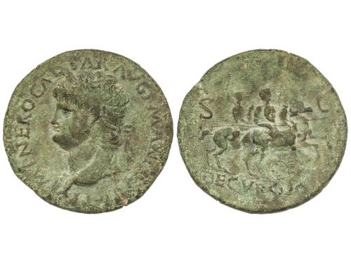 IMPERIO ROMANO. Sestercio. 67 d.C. NERÓN. Lugdunum. Anv.: IMP. NERO CAESAR AVG. P. MAX. TR. POT. P. P. Cabeza laureada a izquierda. Rev.: DECVRSIO S. C. Nerón a galope a derecha con cetro, seguido de soldado a caballo con estandarte. 21,09 grs. (Oxidaciones). Pátina verde. ESCASA. C.-88; BMC-316; RIC-508. MBC/MBC-.