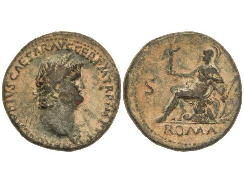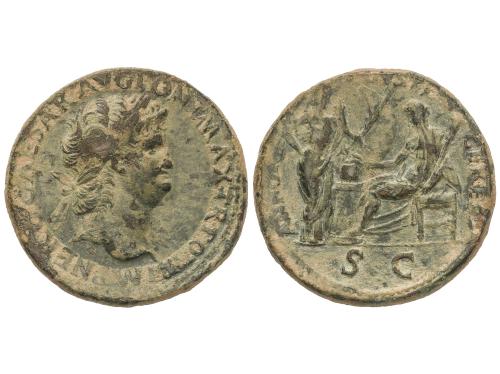 IMPERIO ROMANO. Sestercio. 65 d.C. NERÓN. Anv.: NERO CLAVDIVS CAESAR AVG. GER. P. M. TR. P. IMP. P. P. Busto laureado a la derecha. Rev.: ROMA S. C. Roma sentada a izquierda sobre coraza y escudos, con Victoria y parazonio con el pie sobre un casco. 25,76 grs. Pátina marrón. ESCASA. C.-264; BMC-180; RIC-275. MBC.