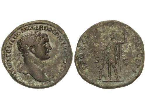 IMPERIO ROMANO. Sestercio. 103-111 d.C. TRAJANO. Anv.: IMP. CAES. NERVAE TRAIANO AVG. GER. DAC. P. M. TR. P. COS V P. P. Cabeza laureada a derecha. Rev.: S. P. Q. R. OPTIMO PRINCIPI S. C. Roma en pie a izquierda, sosteniendo Victoria; a sus pies dacio arrodillado. 24,81 grs. Pátina verde. (Leves oxidaciones). C-10. MBC/MBC-.