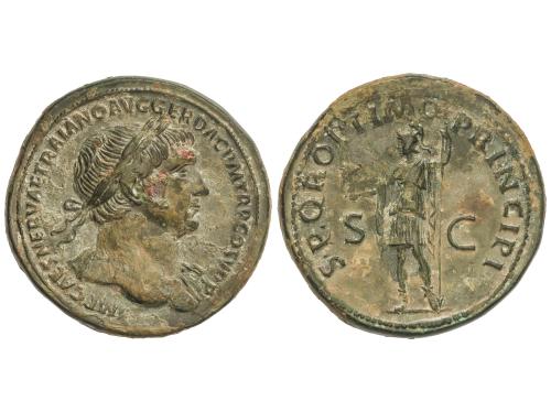 IMPERIO ROMANO. Sestercio. 103-111 d.C. TRAJANO. Anv.: IMP. CAES. NERVAE TRAIANO AVG. GER. DAC. P. M. TR. P. COS V P. P. Cabeza laureada a derecha. Rev.: S. P. Q. R. OPTIMO PRINCIPI S. C. Roma en pie a izquierda, con victoria y lanza. 29,41 grs. (Oxidaciones). Pátina. RIC-486. MBC.