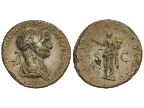 IMPERIO ROMANO. Sestercio. 112-114 d.C. TRAJANO. Anv.: IMP. CAES. NERVAE TRAIANO AVG. GER. DAC. P. M. TR. P. COS. VI P. P. Busto laureado a derecha. Rev.: FELICITAS AVGVST. S. C. Felicidad estante a izquierda con cornucopia y cetro. 24,93 grs. (Oxidaciones, algo limpiada). C-143. MBC.