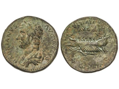 IMPERIO ROMANO. Sestercio. 132-134 d.C. ADRIANO. Anv.: HADRIANVS AVGVSTVS. Cabeza laureada a la izquierda. Rev.: FELICITATI AVG. Galera a la derecha; S-C a través de los campos, COS III P P en exergo. 25,67 grs. (Oxidaciones, algo realzada). Pátina verde. ESCASA. C-689; RIC-1311. (MBC).