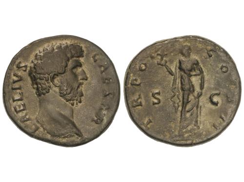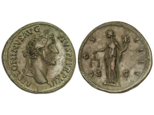 IMPERIO ROMANO. Sestercio. 149-150 d.C. ANTONINO PÍO. Anv.: ANTONINVS AVG. PIVS P. P. TR. P. XIII. Cabeza laureada a derecha. Rev.: COS. IIII S. C. Equidad en pie a izquierda con balanza y cornucopia. 28,59 grs. (Leves oxidaciones, algo realzada). C-244. MBC+.