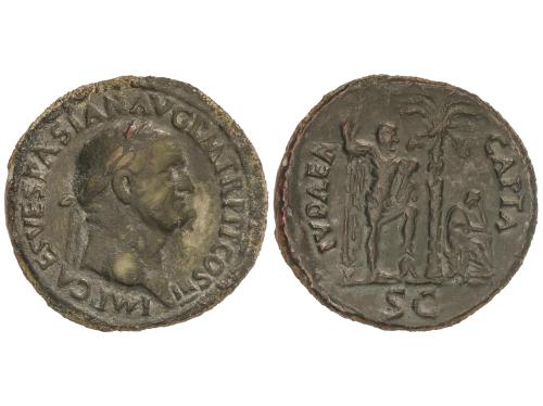 IMPERIO ROMANO. Sestercio. 72 d.C. VESPASIANO. Anv.: IMP. CAES. VESPASIAN AVG P. M. TR. P. P. P. COS III. Busto laureado a derecha . Rev.: IVDAEA CAPTA / S C. Vespasiano en vestimenta militar con lanza y parazonium, pisando un casco, detrás de palmera con Judea en actitud moribunda. 25,57 grs. (Leves oxidaciones, algo realzada). Pátina. ESCASA. C- 239; RIC-167. MBC-.