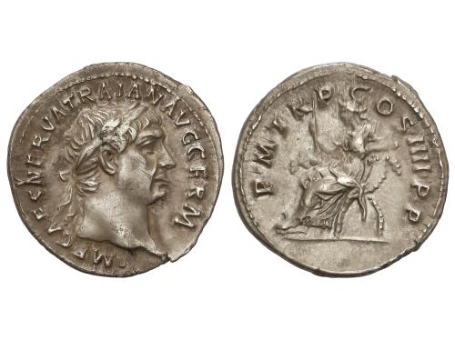 IMPERIO ROMANO. Denario. 103-112 d.C. TRAJANO. Anv.: IMP. TRAIANO AVG. GER. DAC. P. M. TR. P. Cabeza laureada a derecha. Rev.: COS. V. P. P. S. P. Q. R. OPTIMO PRINC. Trofeo formado por túnica, yelmo, dos escudos, en la base dos espadas, dos jabalinas y dos escudos. 3,63 grs. C-98; RIC-147; BMC-358. EBC-.