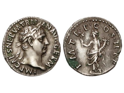 IMPERIO ROMANO. Denario. 98-99 d.C. TRAJANO. Anv.: IMP. CAES. NERVA TRAIAN. AVG GERM. Cabeza laureada a derecha . Rev.: P. M. TR. P. COS II P. P. Paz portando cornucopia y rama de olivo. 3,30 grs. (Pequeña oxidación en reverso). Pátina. C-209; BMC-39; RIC-6. EBC-.