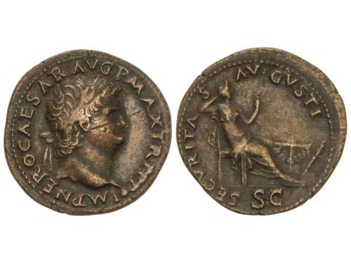 IMPERIO ROMANO. Dupondio. 66 d.C. NERÓN. Anv.: IMP. NERO CAESAR AVG. P. MAX. TR. P. P. P. Cabeza laureada a derecha con globo debajo. Rev.: SECVRITAS AVGVSTI S.C. Seguridad sentada a derecha, delante altar. 14,62 grs. (Oxidaciones). Pátina. C-324; RIC-518; BMC-341. MBC+.