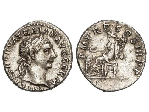 IMPERIO ROMANO. Denario. 103-112 d.C. TRAJANO. Anv.: IMP. TRAIANO AVG. GER. DAC. P. M. TR. P. Cabeza laureada a derecha. Rev.: COS. V. P. P. S. P. Q. R. OPTIMO PRINC. Trofeo formado por túnica, yelmo, dos escudos, en la base dos espadas, dos jabalinas y dos escudos. 3,63 grs. C-98; RIC-147; BMC-358. EBC-.