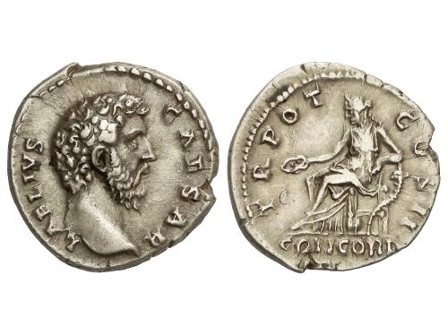IMPERIO ROMANO. Denario. 137 d.C. AELIO. Anv.: L. AELIVS CAESAR. Cabeza descubierta de Aelio a derecha. Rev.: TR. POT. COS. II. Concordia sentada en trono a izquierda, con pátera y cornucopia. En exergo: CONCORD. 3,03 grs. ESCASA. C-1; RIC-436; BMC-981. MBC+.