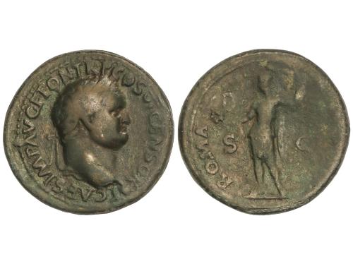 IMPERIO ROMANO. Sestercio. 77-78 d.C. TITO. LUGDUNUM. Anv.: T. CAES. IMP. AVG. F. PON. TR. P. COS. VI CENSOR. Cabeza del emperador a derecha. Rev.: ROMA S C. Roma, de pie, a la izquierda, portando Victoria y lanza. 21,29 grs. ESCASA. C-184; RIC-1247. MBC.