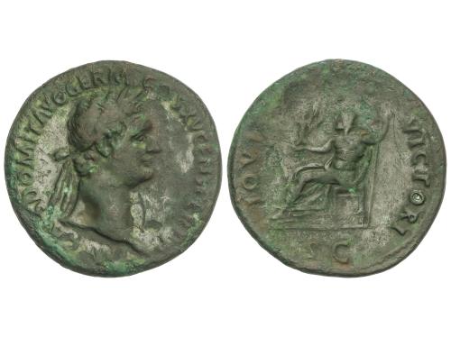 IMPERIO ROMANO. Sestercio. 90-91 d.C. DOMICIANO. ROMA. Anv.: IMP. CAES. DOMIT. AVG. GERM. COS. XV CENS. PER. P. P. Cabeza laureada a derecha. Rev.: IOVI VICTORI. Júpiter sentado a izquierda con victoria y cetro. En exergo S C. 23,08 grs. Pátina verde. C-314; RIC-702. MBC. Ex INASTA 28 - 23 noviembre 2008, n. 346.