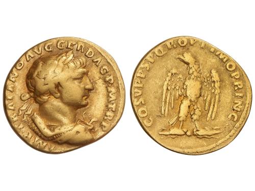 IMPERIO ROMANO. Áureo. 103-111 d.C. TRAJANO. Anv.: IMP. TRAIANO AVG. GER. DAC. P. M. TR. P. Busto laureado, drapeado y corazado a derecha. Rev.: S. V. P. P. S. P. Q. R. OPTIMO PRINC. Águila explayada mirando a la izquierda, encima de un haz de rayos. 6,18 grs. C-96 (Busto no corazado); RIC-144 (Busto no corazado); XC-1009. MBC-.