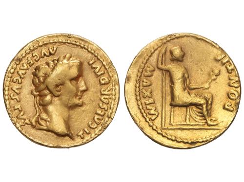 IMPERIO ROMANO. Áureo. 14-17 d.C. TIBERIO. LUGDUNUM (Lyon). Anv.: TI. CAESAR DIVI AVG. F. AVGVSTVS. Cabeza laureada de Tiberio a derecha. Rev.: PONTIF. MAXIM. Livia sentada a derecha con cetro y flor. 7,14 grs. (Probablemente ha estado en aro). C-15; RIC-27; XC-305. MBC-.