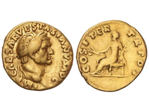IMPERIO ROMANO. Áureo. 69-70 d.C. VESPASIANO. ROMA y TARRACO. Anv.: IMP. CAESAR VESPASIANVS AVG. Cabeza laureada de Vespasiano a derecha. Rev.: COS. ITER. TR. POT. La Paz sentada a izquierda con rama y caduceo. 7,06 grs. C-No cat; RIC-263 (var. leyenda); XC-607. MBC/MBC-.