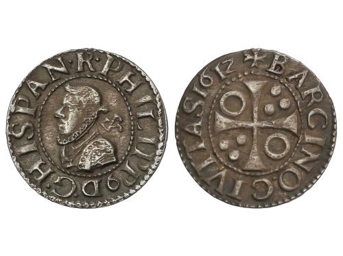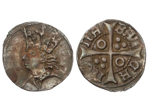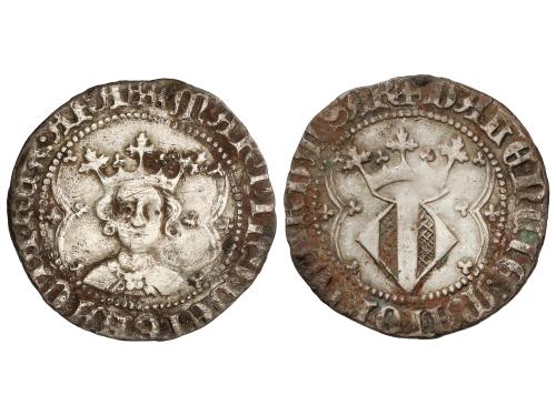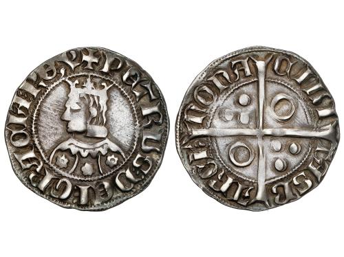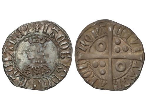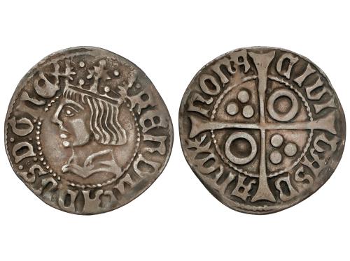 CATALUNYA-ARAGÓN. Croat. JAUME II. BARCELONA. Anv.: IACOBVS DEI GRACIA REX. Efigie coronada a izquierda. Vestido de tres áreas con flores iguales de 5 pétalos. Rev.: CIVI-TASB-ARCh´ -NONA. Anillos en 1er y 4º espacios. 2,69 grs. Pátina. Cru.VS-339. MBC+.
