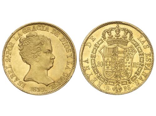 ISABEL II. 80 Reales. 1839. BARCELONA. P.S. 6,77 grs. (Leves rayitas en anverso). Brillo original. AC-704. EBC.