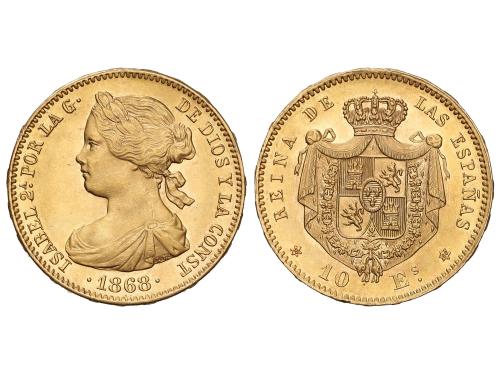 ISABEL II. 10 Escudos. 1868 (*18-68). MADRID. 8,34 grs. AU (900). (Ínfimas marquitas). Brillo original. AC-815. EBC/EBC+.