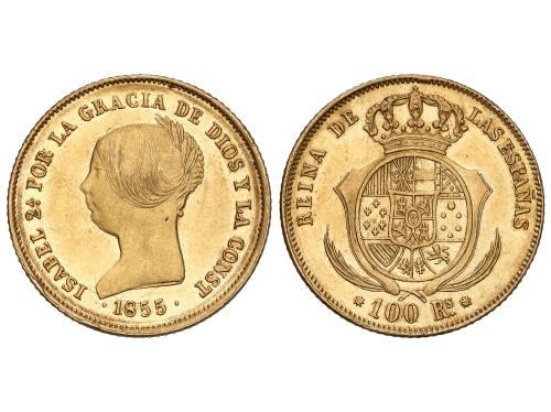 ISABEL II. 100 Reales. 1855. BARCELONA. 8,38 grs. Restos de brillo original. AC-763. EBC-.