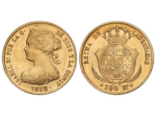 ISABEL II. 100 Reales. 1858. BARCELONA. 8,25 grs. Restos de brillo. AC-769. EBC-/EBC.