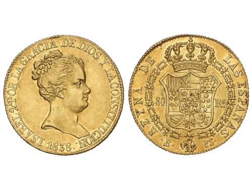 ISABEL II. 80 Reales. 1838. BARCELONA. P.S. 6,74 grs. Final leyenda anverso: CONSTITUCION. (Leves rayitas). AC-701. EBC-.