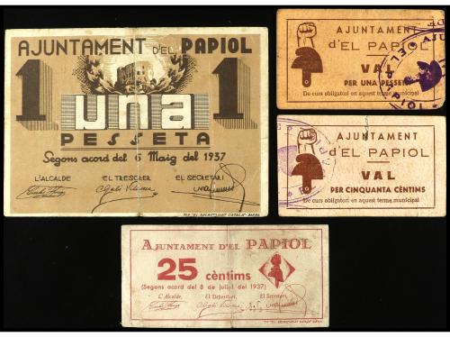 CATALUNYA. Lote 4 billetes 25, 50 Cèntims y 1 Pesseta (2). Sin Fecha y 6 Maig 1937. Aj. d´EL PAPIOL. 50 Cts Serie E, 1 Pta Serie D. RAROS. AT-1777d, 1778 c, 1779, 1780. MBC- a MBC+.