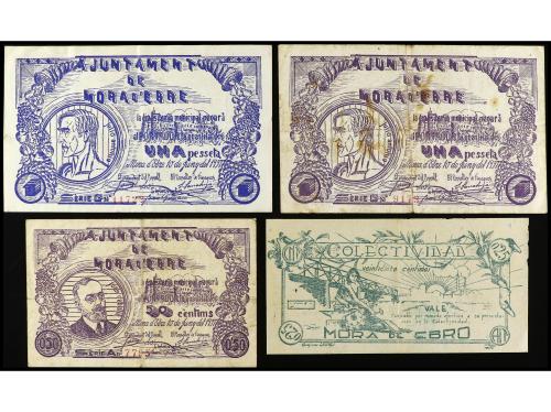 CATALUNYA. Lote 4 billetes 25, 50 Cèntims y 1 Pesseta (2). Aj. de MORA D´EBRE y Colectivitat MORA DE EBRO. AT-1611, 1612 1613; T-1849. MBC a MBC+.