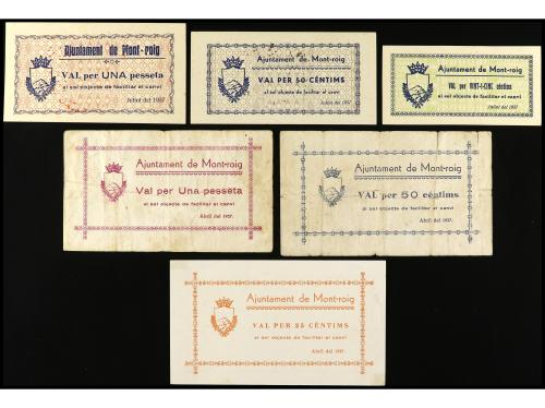 CATALUNYA. Lote 6 billetes 25 (2) y 50 Cèntims (2) y 1 Pesseta (2). Abril y Juliol 1937. Aj. de MONTROIG. AT-AT-1597/99, 1600/02. BC+ a EBC.