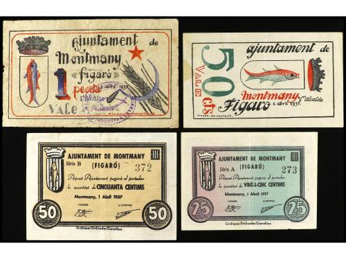 CATALUNYA. Lote 4 billetes 25 y 50 Cèntims (2) y 1 Pesseta. Abril 1937. Aj. de MONTMANY (FIGARÓ). AT-1581, 1582, 1584, 1585. MBC a EBC-.