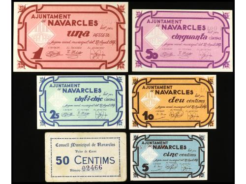 CATALUNYA. Lote 6 billetes 5, 10, 25, 50 Cèntims (2) y 1 Pesseta. Aj. de NAVARCLES. AT-1640a, 1641/1645. MBC+ a EBC.