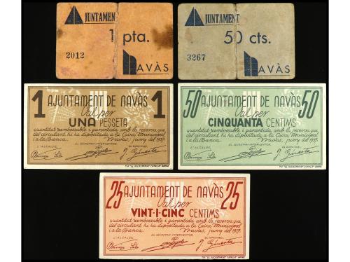 CATALUNYA. Lote de 5 billetes de 25, 50 Cèntims (2) y 1 Pesseta (2). Aj. de NAVAS. AT-1646/47, 1648/50. BC+ a EBC-.