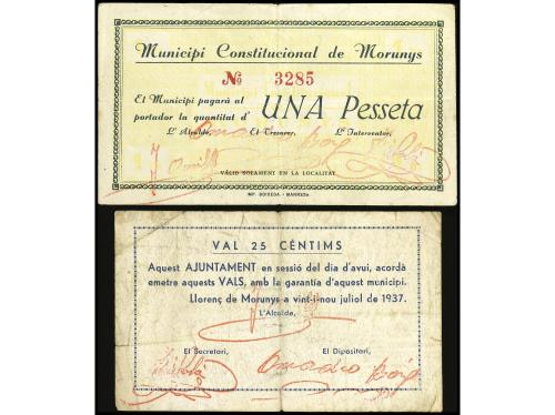 CATALUNYA. Lote 2 billetes 25 Cèntims y 1 Pesseta. Aj. y MUNICIPI CONSTITUCIONAL de MORUNYS. ESCASOS. AT-1631, 1632. MBC- a MBC.