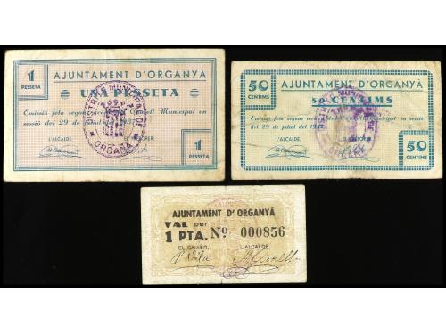 CATALUNYA. Lote 3 billetes 50 Cèntims y 1 Pesseta. Aj. d´ ORGANYÀ. MUY ESCASOS. AT-1714, 1716, 1717. MBC.