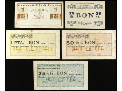 CATALUNYA. Lote 5 billetes 25 (2) y 50 Cèntims y 1 Pesseta (2). Aj. d´ OS DE BALAGUER. AT-1722/1724, 1725/1726. MBC- a MBC+.