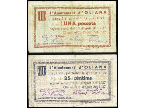 CATALUNYA. Lote 2 billetes 25 Cèntims y 1 Pesseta. 10 Agost 1937. Aj. d´OLIANA. (Sucios). AT-1688, 1690. MBC.