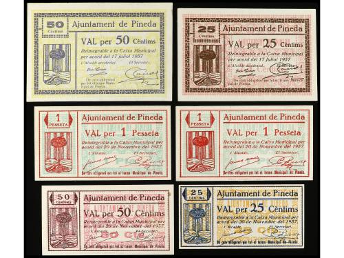 CATALUNYA. Lote 6 billetes 25 (2) y 50 Cèntims (2) y 1 Pesseta (2). Juliol y Novembre 1937. Aj. de PINEDA. AT-1822/23, 1824/26. EBC- a EBC+.