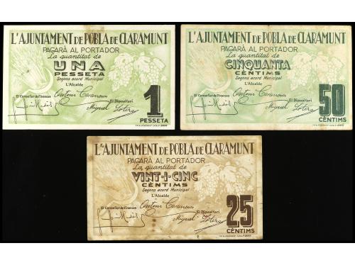 CATALUNYA. Lote 3 billetes 25, 50 Cèntims y 1 Pesseta. Aj. de POBLA DE CLARAMUNT. AT-1896/1898. MBC a MBC+.