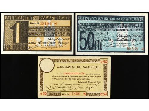 CATALUNYA. Lote 3 billetes 50 (2) Cèntims y 1 Pesseta. Febrer y Agost de 1937. Aj. de PALAFRUGELL. AT-1741, 1742 y 1743. EBC- a EBC.