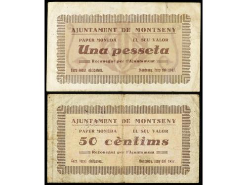 CATALUNYA. Lote de 2 billetes de 50 Cèntims y 1 Pesseta. Juny 1937. Aj. de MONTSENY. AT-1609/10. MBC.