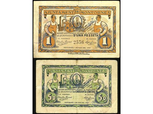 CATALUNYA. Lote 2 billetes 50 Cèntims y 1 Pesseta. 1 Maig 1937. Aj. de MONTORNÈS. AT-1591/92. MBC.