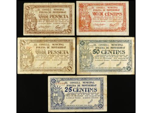 CATALUNYA. Lote 5 billetes 25 (2), 50 Cèntims y 1 Pesseta (2). Maig y Setembre 1937. C.M. d´ OLESA DE MONTSERRAT. AT-1678/82. MBC.