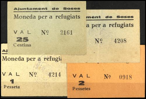 CATALUNYA. Lote 4 vales 25 y 50 Cèntims y 1 y 2 Pessetes. Aj. de SOSES. MONEDA PER A REFUGIATS. RAROS. AT-2405/07. MBC+ a EBC-.