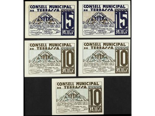 CATALUNYA. Lote 5 billetes 10 (3) y 15 Cèntims (2). Novembre 1937. C.M. de TERRASSA. De 10 Cèntims incluye pareja correlativa. AT-2458a, 2459a (2). SC- a SC.