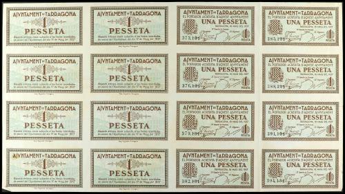CATALUNYA. Lote 16 billetes 1 Pesseta. 18 Maig 1937. Aj. de TARRAGONA. Bloque de dieciseis en plancha y sin cortar. (Leves roturitas en margen y leves manchitas del tiempo, arrugas). AT-2435. EBC+.