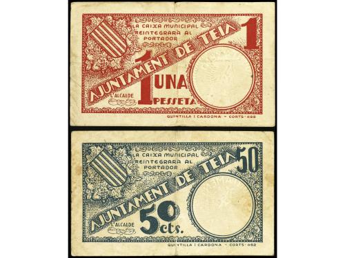 CATALUNYA. Lote 2 billetes 50 Cèntims y 1 Pesseta. Aj. de TEIÀ. (Manchitas). AT-2449, 2450. MBC.