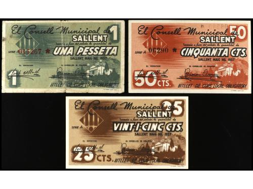 CATALUNYA. Lote 3 billetes 25, 50 Cèntims y 1 Pesseta. Maig 1937. C.M. de SALLENT. (El de 1 Pesseta roturas). AT-2258, 2259, 2260. MBC- a EBC-.