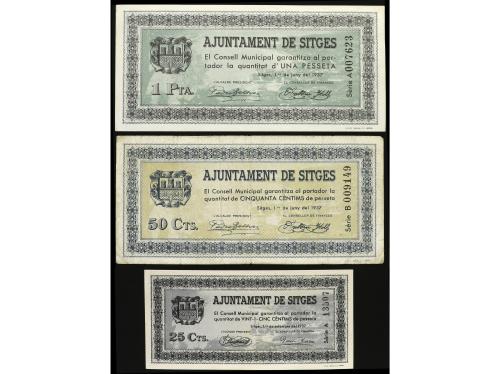 CATALUNYA. Lote 3 billetes 25, 50 Cèntims y 1 Pesseta. 1 Juny 1937. Aj. de SITGES. AT-2379/2381. MBC a EBC-.