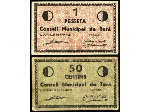 CATALUNYA. Lote 2 billetes 50 Cèntims y 1 Pesseta. C.M. de TORÀ. AT-2506, 2507. MBC a MBC+.